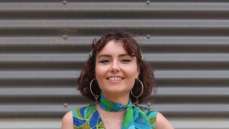 I AM WEARING a two-piece set that my friends found. I was on a break at work and they came in because they went to the op shop across the road and they found this really good outfit. It didn't fit them so they came in and gave it to me. It's really cute. They're separates, so it's matching flares and a top. The top is actually really long but I've folded it under. Then I've got this op shop scarf that I love.