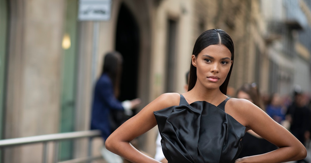 Miranda’s dress had a snug fit that showcased her hourglass figure. The garment featured a plunging V-neck, long sleeves, and a hemline that skimmed the upper part of her shapely thighs. The sleeves were adorned with long, dangling fringe. The ornamental strings gave Miranda’s look some flirty country flair. She posed with both arms raised up, revealing the flashy fringe.