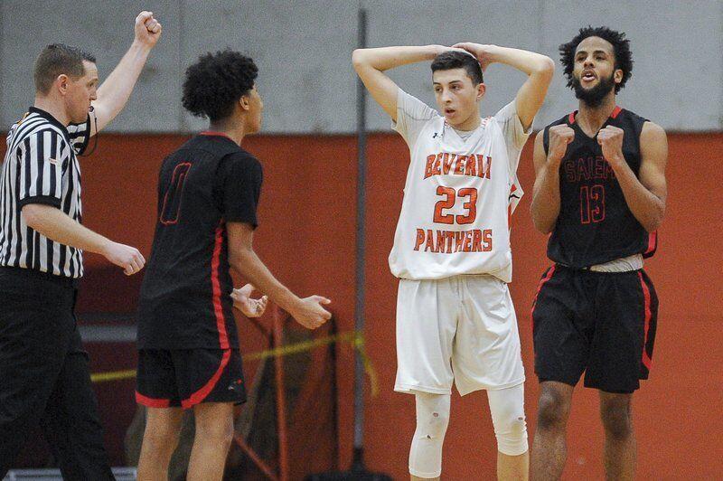 JAIME CAMPOS/Staff photo Salem's Isaiah Williamson celebrates with teammate Guillermo Pimentel after securing the win for the Witches during a basketball game against Salem in 2019. Beverly got the best of their NEC rivals the following year in a matchup that has heated up over the years. 1/25/2019
