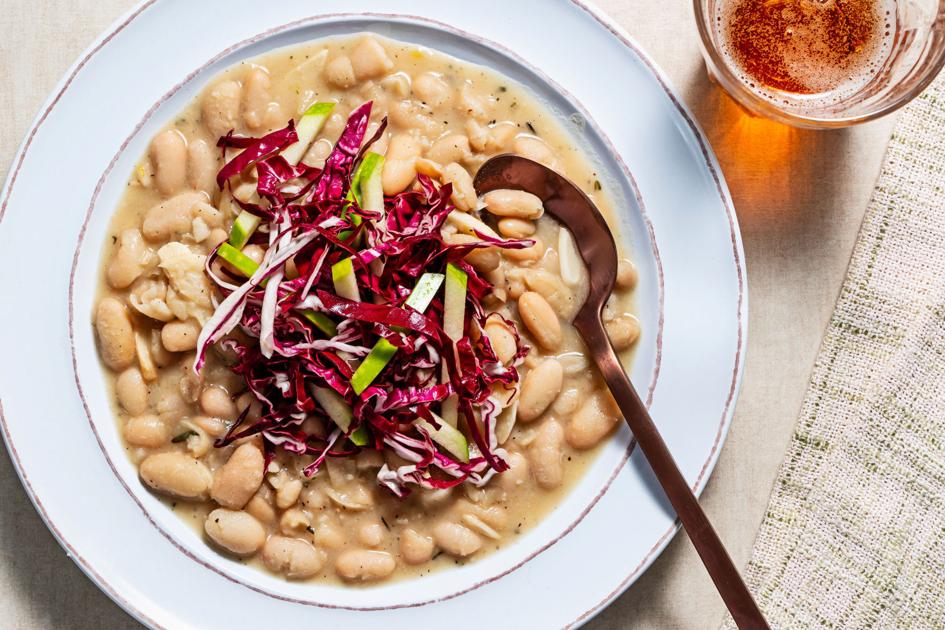 That's the idea behind this dish, where a crisp, jewel-toned salad crowns a warm, white bean stew for a simple but splendid meal in a bowl.
