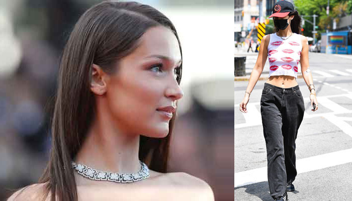 Supermodel Bella Hadid dropped jaws in a pair of low-rise jeans and a kissy lips crop top as she stepped out in NYC this weekend.
