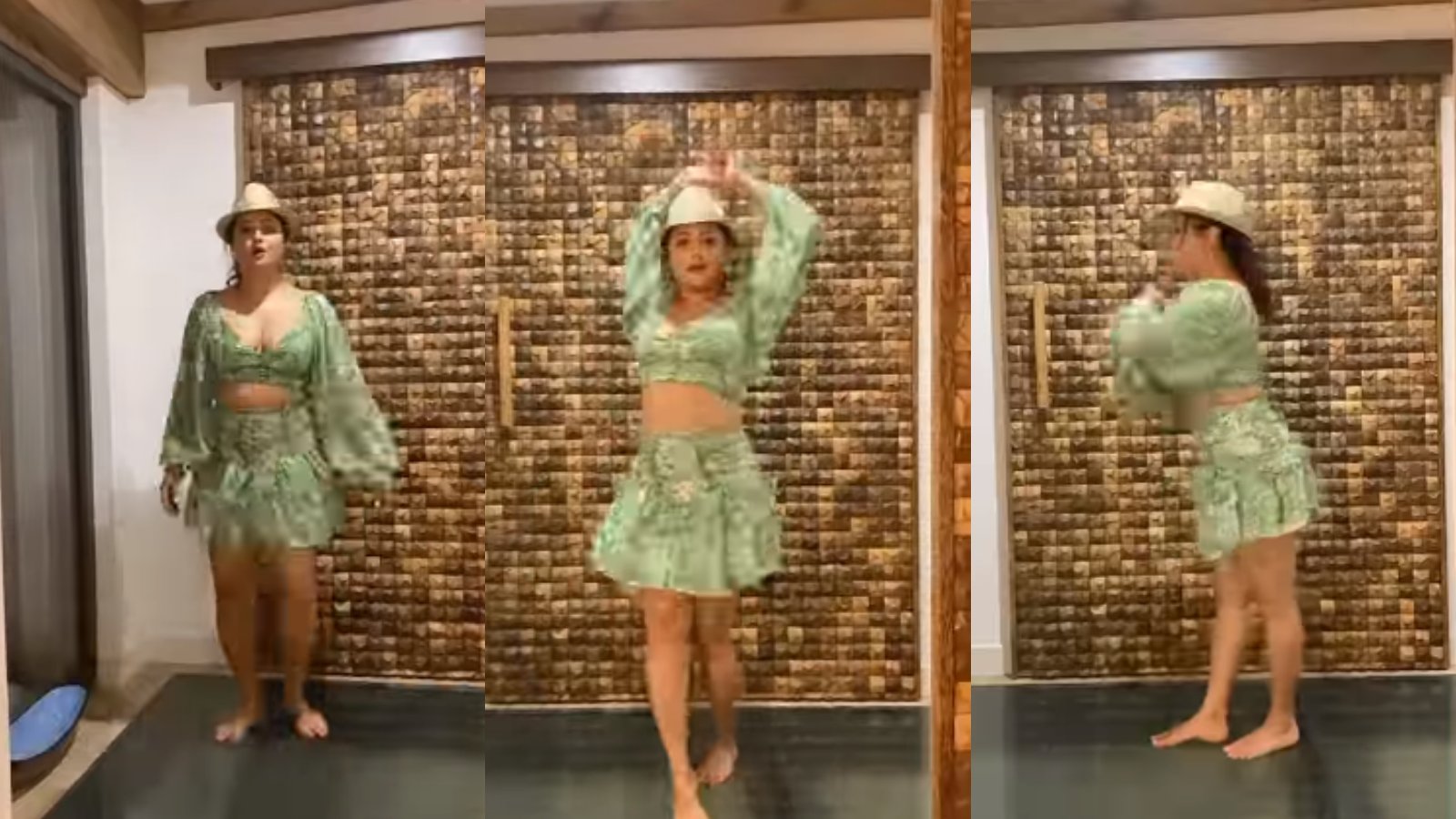 In the video, the actress is seen dressed in a floral printed green co-ord set. Her top featured a plunging neckline and baggy sleeves, while her skirts had frills. She matched her outfit with a hat.