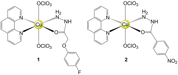 Chemical structure of two Cu II complexes named [Cu(4-fh)(phen)(ClO 4 ) 2 ]-complex 1 , and [Cu(4-nh)(phen)(ClO 4 ) 2 ]·H 2 O-complex 2 (4-fh = 4-fluorophenoxyacetic acid hydrazide, 4-nh = 4-nitrobenzoic hydrazide and phen = 1,10-phenanthroline).