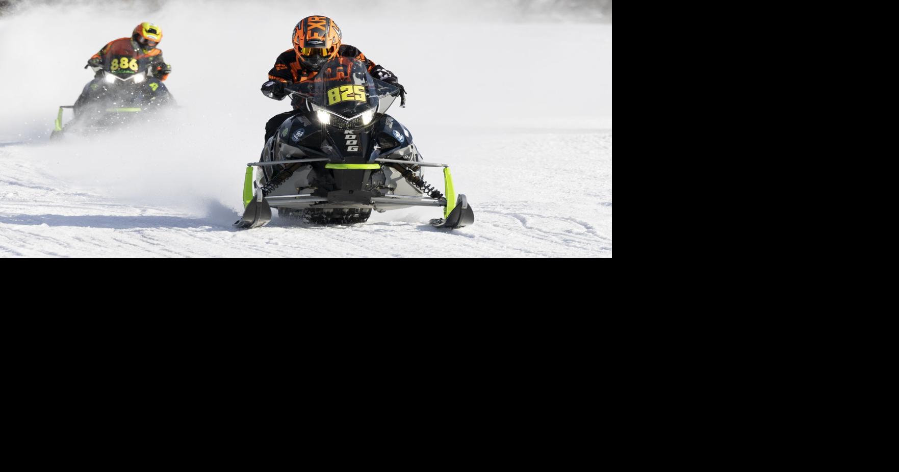 Paul Sillerud, front, races in the vintage class, while Madyson Landin races in the Junior class during the Okoboji 100 snowmobile races, Saturday, in Okoboji, Iowa.
