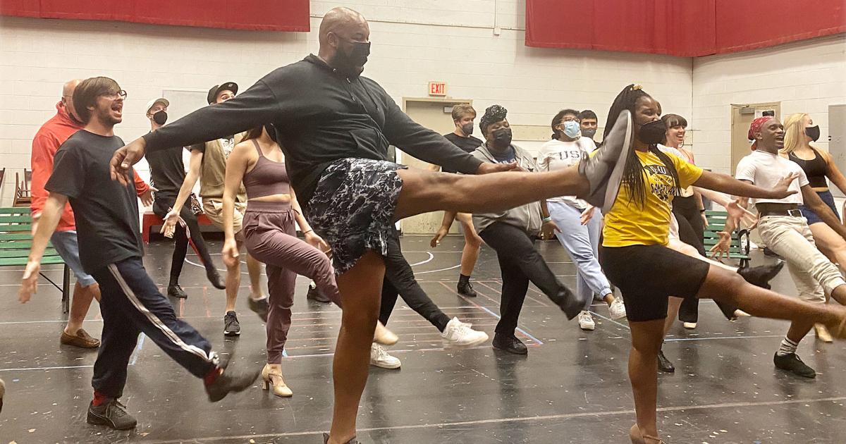 Cast members from "42nd Street," at the Shenandoah Summer Music Theatre, are pictured, with Jermaine Miles, center, Naja Bates, at right, and Shiloh Orr, at left. Though some wore masks in rehearsals, the cast will not be wearing masks at the performances.