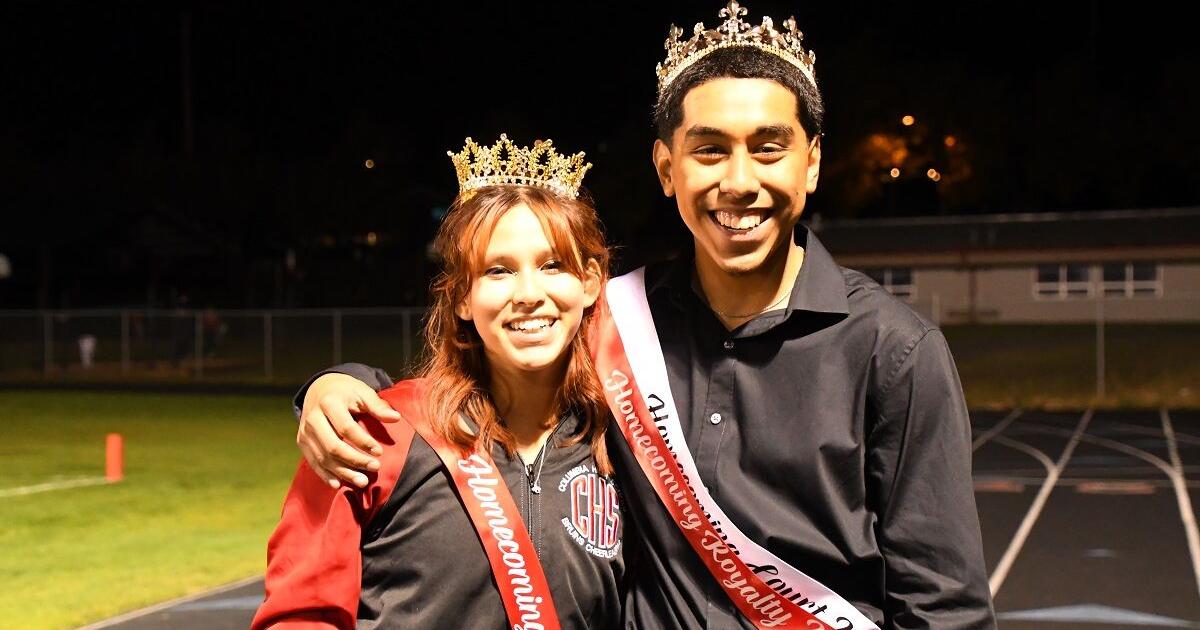 Columbia High School Homecoming Court Royalty, seniors Julie Salazar and Ozvaldo Orozco, stand for a photograph after their coronation at half time.