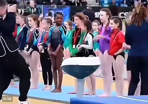 The video, filmed during a gymnastics competition in Ireland in March of the previous year, reveals a group of young gymnasts awaiting the presentation of their medals.