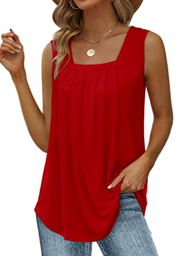 Saloogoe Summer Tank Tops for Women Loose Fit Pleated Square Neck Sleeveless Tops Curved Hem Flowy.